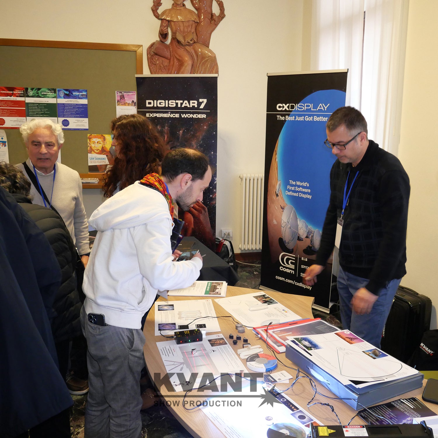 Laser display systems for graphics, beam show, mapping and special effects, multimedia installations and exhibits, interactive exhibits and installations, exhibition models, holograms and holographic projection, LED sphere backlights, LED screens, LED tunnel, projection mashes, 3D video and laser mapping, content proposal, media servers, 360 degree projection spheres (inflatable, plastic), virtual reality, art installations, interactive floor mapping, temporary or permanent and indoor or outdoor installations and projections, own mobile dome for 360 degree video and laser projection for special events, etc.